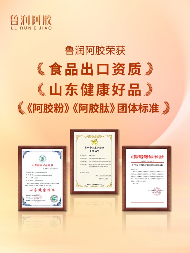 山东鲁润阿胶药业有限公司的名誉殿堂内,一边挂满种种奖牌证书的名誉墙熠熠生辉。省级非遗认证、菏泽老字号、邦度高新手艺企业、省出名字号、邦度AAA级旅逛景区、小分子重心实践室、安详出产模范化企业、山东健壮好品、工业旅逛树模基地、小分子阿胶重心实践室、邦度科技型中小企业、食物出口天赋、众个平台副会长单元等众项名誉,既是企业苦守匠心、深耕品德的睹证,也是行业与消费者的高度认同。